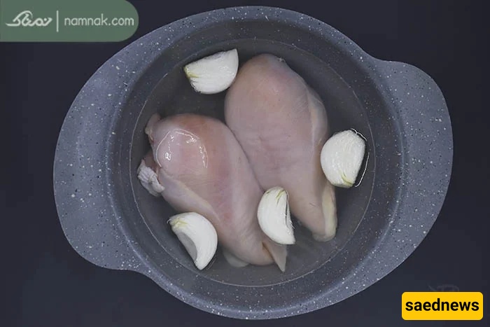 Place the chicken breasts in water over high heat. Chop one onion and add it to the chicken.