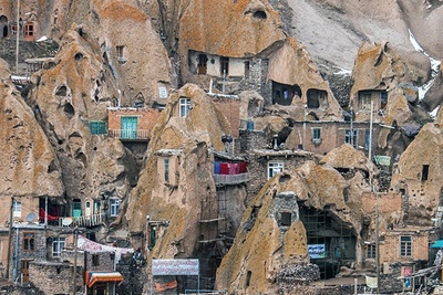 This amazing village is located in East Azerbaijan province, 65 kilometers from Tabriz city, 18 kilometers from Esko county, in a valley next to the Kandovan River. It has a cold, mountainous climate and is famous as the rock village of Iran and the third rock village in the world. However, interestingly, unlike the two other rock villages—one in Cappadocia, Turkey, and the second, Dakota village in the USA—Kandovan is inhabited, and people live there.