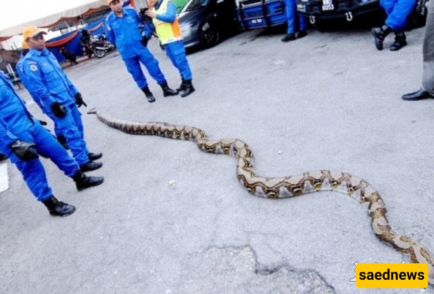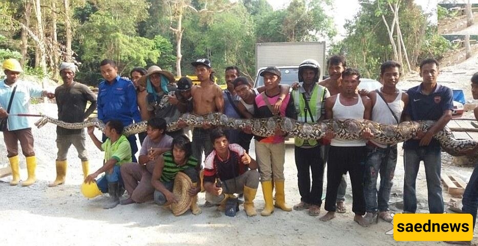 According to Saed News’ Social Affairs Service, this gigantic snake is considered the largest ever discovered, measuring around 8 meters. It was found in Malaysia, and it took approximately 12 people to capture this terrifying creature.
