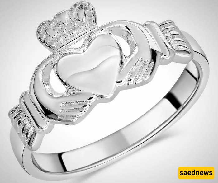 Irish engagement rings feature a heart held by two hands with a crown above it. The heart symbolizes love, the hands represent support, and the crown signifies loyalty. Rings are usually worn on the left hand, with the heart pointing toward the fingertips before the wedding and rotated toward the wrist on the wedding day.