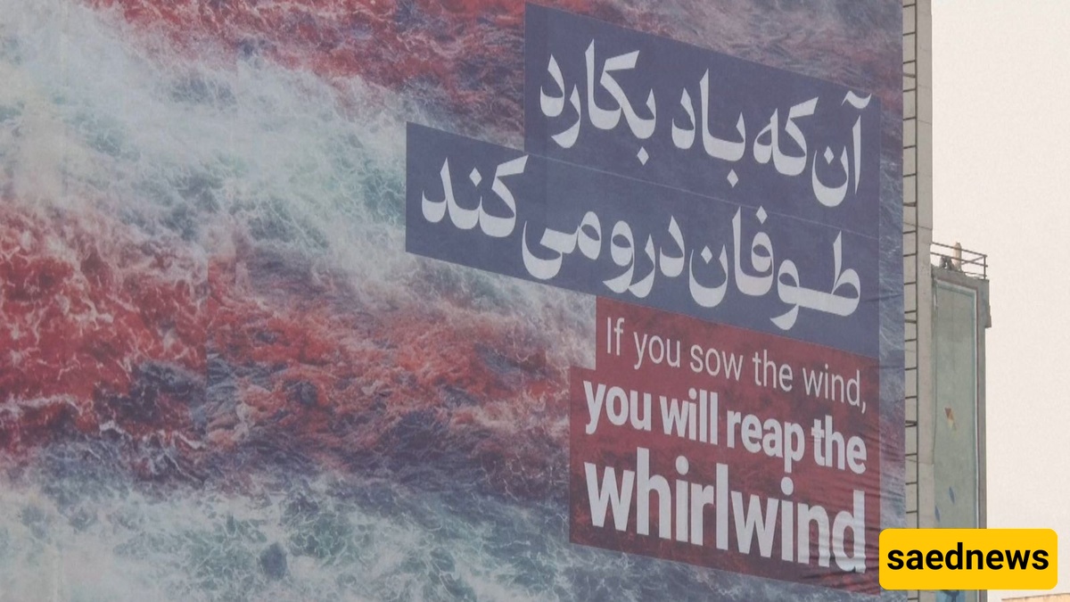 According to the Political Service of Saed News, Sky News wrote: On Friday, Tehran’s Enqelab Square witnessed the unveiling of a new mural depicting damaged airplanes on the deck of an aircraft carrier. The artwork carries a warning in both Persian and English: “Whoever sows the wind will reap the storm.”