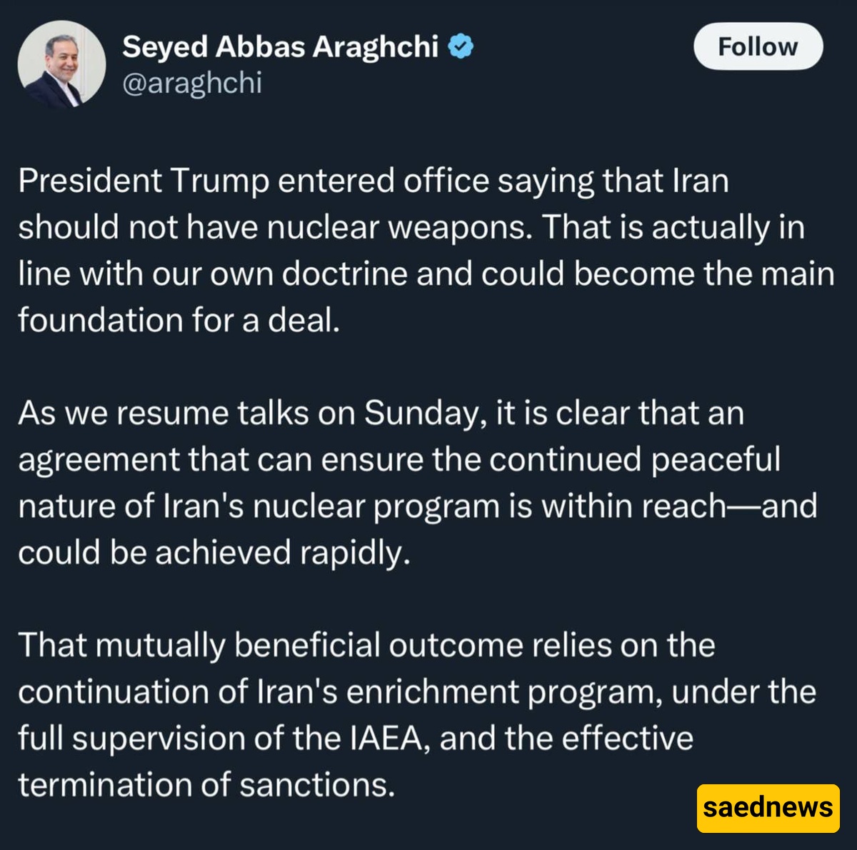 Saed News: Seyed Abbas Araghchi is currently in Oslo and has an important speech ahead. Our country's Deputy Foreign Minister made headlines by posting a tweet addressed to Trump.