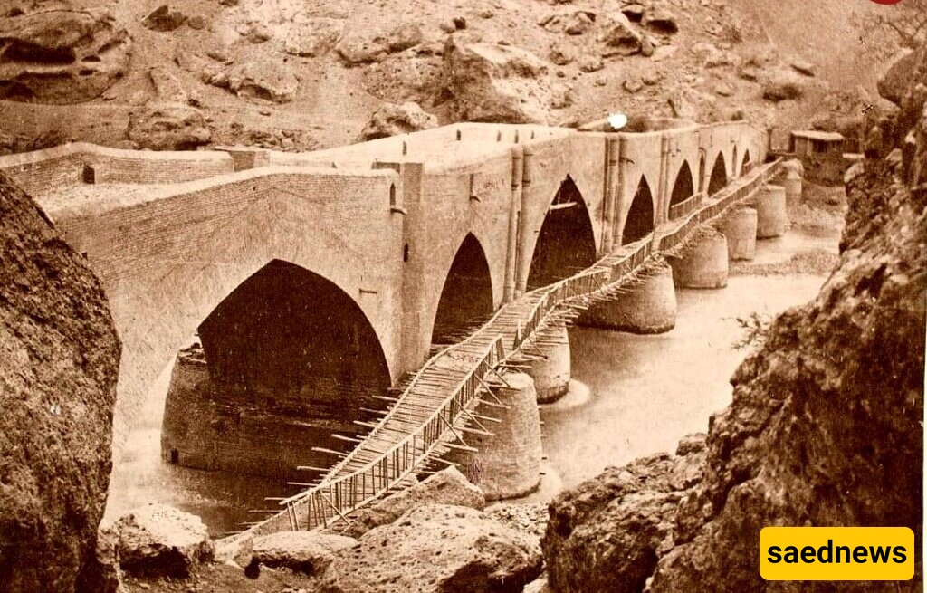 The fourth image captures the Manjil Bridge. The old bridge, dating back to the Safavid era, had been partially destroyed and, as seen in the photo, covered with planks to allow passage. Later, by order of Naser al-Din Shah, a new bridge was constructed alongside the old one, which is also visible in the image.