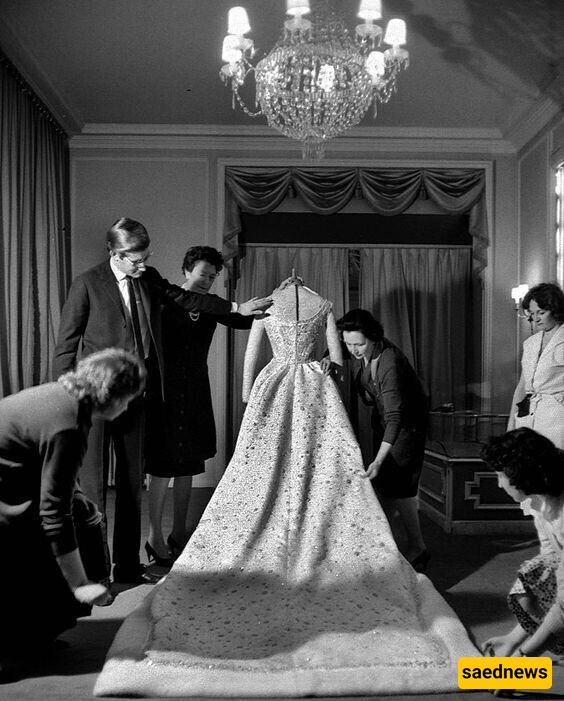 This dress is one of the exquisite and significant garments in the Sa’dabad Cultural-Historical Complex collection and is on display at the Royal Dress Museum. Farah Diba married Mohammad Reza Pahlavi in Azar 1338, and the Shah provided $500,000 for wedding preparations, clothing, and other expenses, which were managed by Farah Diba and her aunt, Mrs. Ghotbi. For the dress alone, one million francs were paid to the Christian Dior House in Paris. This dress was designed by the famous Dior atelier, at a time when Yves Saint Laurent was working for the house.