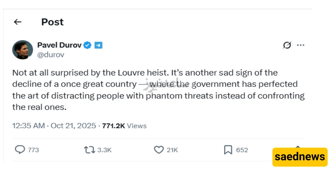 According to the Science and Technology Desk of SaedNews, Telegram founder Paul Durov reacted to the multi-million-euro jewelry theft from the Louvre Museum in Paris with a sarcastic post on his X (formerly Twitter) account.