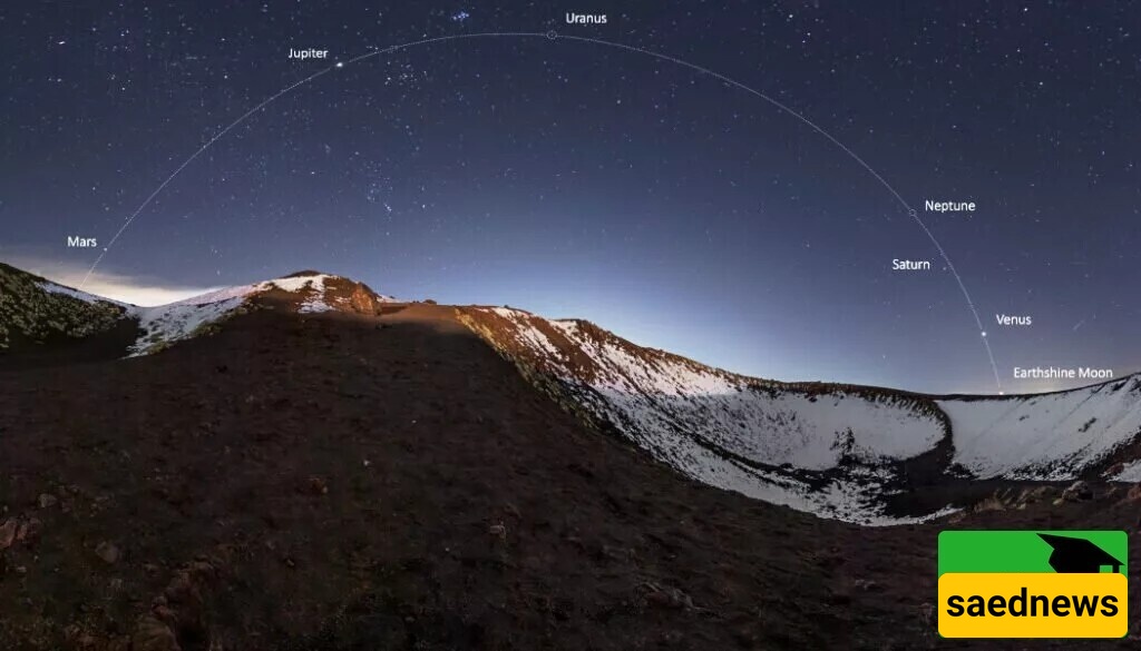 According to the Science Service of Saed News, NASA’s Image of the Day showcases a stunning view of the solar system’s planets aligned in the night sky. On the left side of the image, the bright red planet Mars rises nearly opposite the Sun. The planets Jupiter, Saturn, and Venus—visible even to the naked eye—also appear in the frame. Fainter planets Uranus and Neptune can be clearly seen near the arc of the ecliptic.