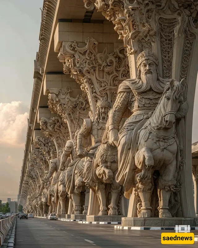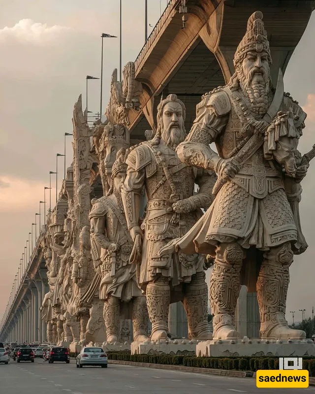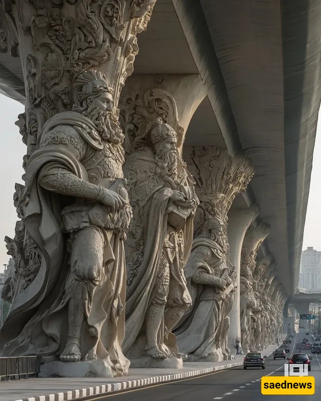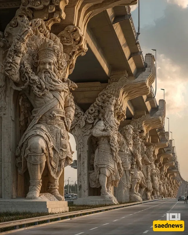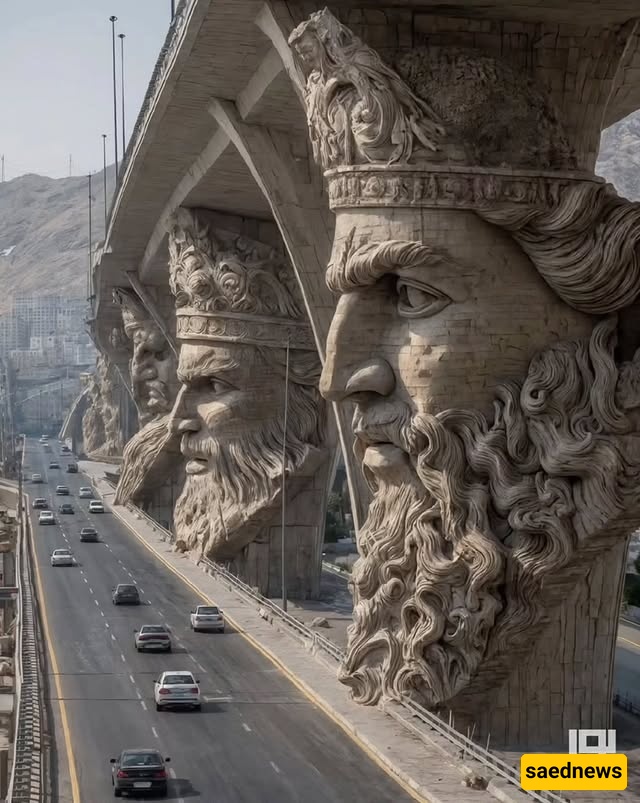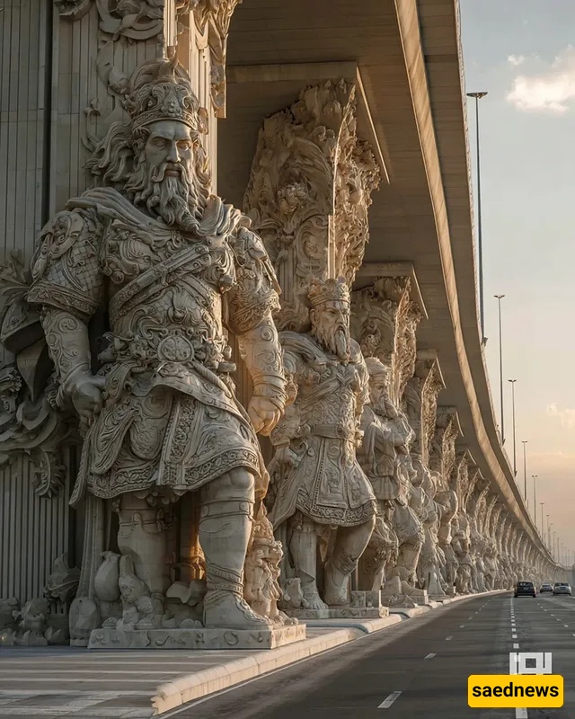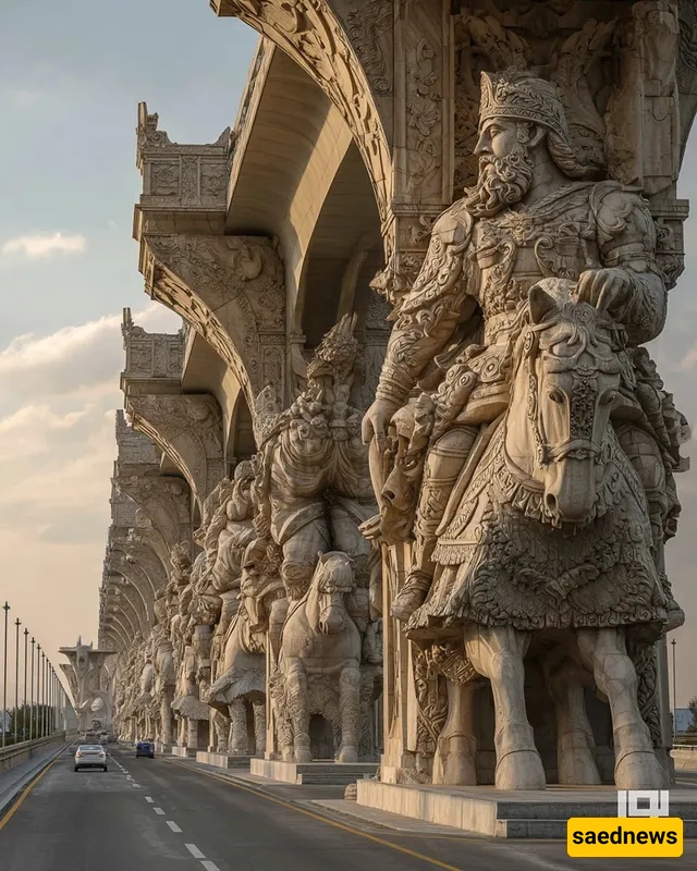 SAEDNEWS: At the city’s heart, a striking bridge rises, its columns inspired by Iran’s ancient myths. Each tells a legendary story, blending art, history, and AI-driven modern creativity in one stunning structure.