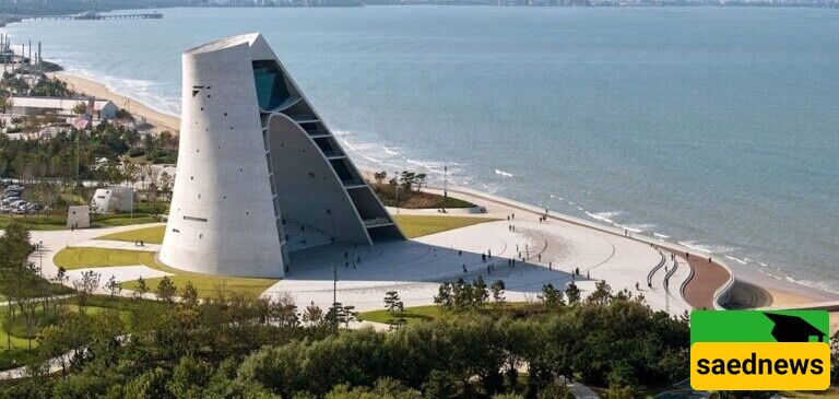 This 50-meter-tall conical tower, located by the coast, was designed by Open Architecture. Its sea-facing side appears sliced open, revealing two interior layers: a library and an observation deck, connected by horizontal slabs.