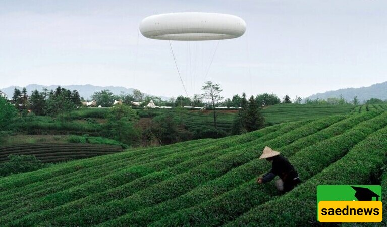 In Zhejiang Province, Line+ Studio designed a woven wooden tunnel and a doughnut-shaped weather balloon. The 20-meter “Woven Passage” consists of curved, interlaced wooden elements inspired by the region’s bamboo weaving tradition. Nearby, the Sky Ring balloon floats as a functional and aesthetic meteorological feature.