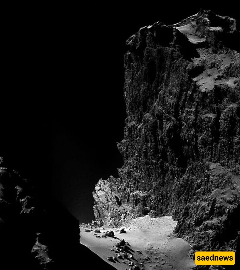 According to the Science Service of Saed News, despite this comet’s cliff reaching a height of one kilometer, the extremely low gravity on the surface of Comet CG may eliminate the risk of jumping off it! At the base of the cliff, a relatively flat area is visible, scattered with large boulders—some reaching up to 20 meters in diameter. Data collected by Rosetta indicate that the deuterium isotope ratio in the comet’s ice differs from that of Earth’s ocean water, suggesting that the origin of this ice is likely different from the source of our planet’s oceans.