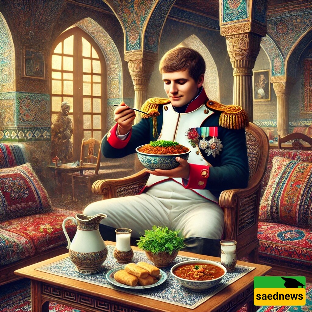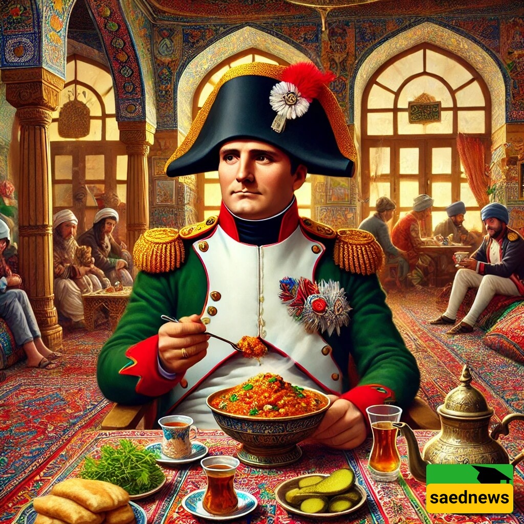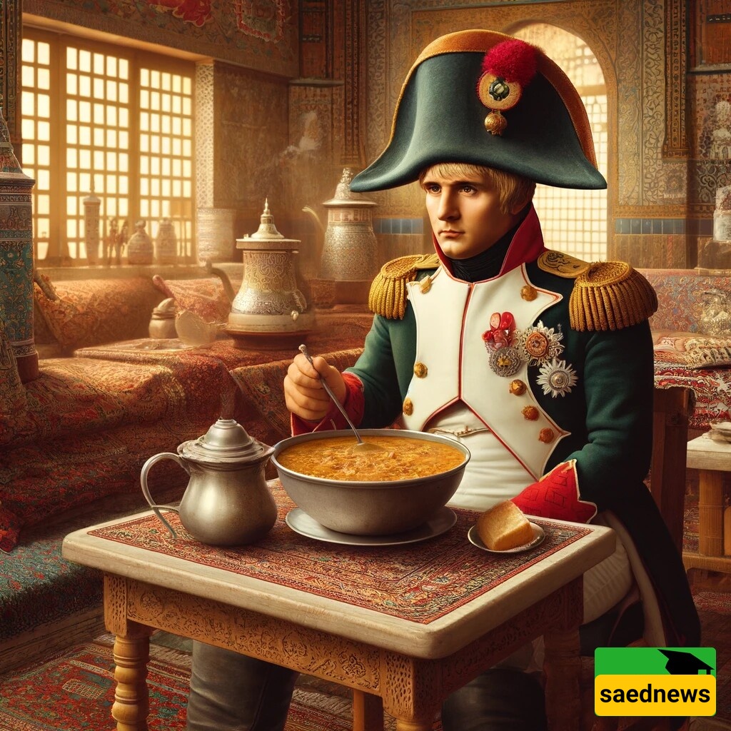 SAEDNEWS: A whimsical image of Napoleon Bonaparte savoring “dizi” in a traditional Iranian teahouse captures the unexpected intersection of culture and history. This surprising scene highlights the allure of Iranian cuisine and illustrates how the flavors and aromas of traditional dishes transcend historical and geographical boundaries.
