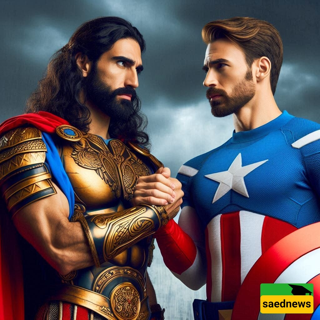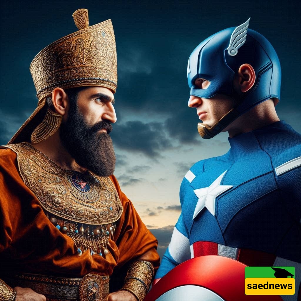 According to the Science and Technology section of SaedNews, the story begins with Captain America traveling to ancient Persia in search of the Infinity Stones. Amidst the ruins of Persepolis, Cyrus the Great appears with his army and, smiling, asks, “Which state are you from? Sparta? Athens?” Captain America, shield gleaming, replies, “No, from the United States of America. I’ve come seeking your aid.” The two heroes, combining Persian wisdom with modern American technology, devise a plan to save the world from a cosmic villain.