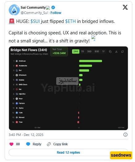 SAEDNEWS: In a notable shift in the cryptocurrency market, the Sui network has overtaken Ethereum in daily capital inflows. This development has drawn analysts’ attention to changing liquidity flows, the rise of emerging projects, and a shift in investor focus from traditional blockchains to next-generation platforms.