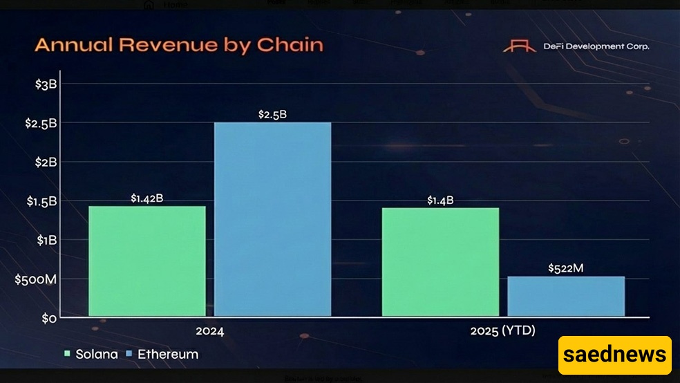 According to the cryptocurrency section of Saed News, Anatoly Yakovenko, founder of Solana, has shared new data indicating that Solana has surpassed Ethereum in annual revenue—a development that could signal a significant shift in how value is distributed in the cryptocurrency market. According to figures published by DeFi Development Corp, Solana’s projected revenue is around $1.4 billion, compared with Ethereum’s estimated $522 million.