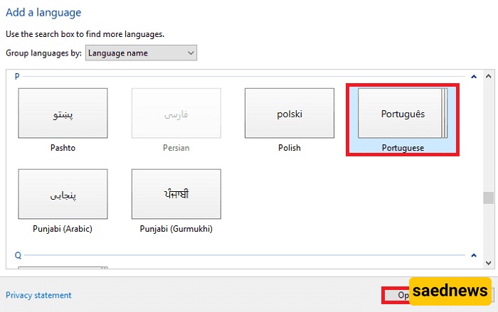 In this section, you can choose your desired language and add it to your Windows 10 system. For example, we want to add Portuguese, so we select Portuguese.
