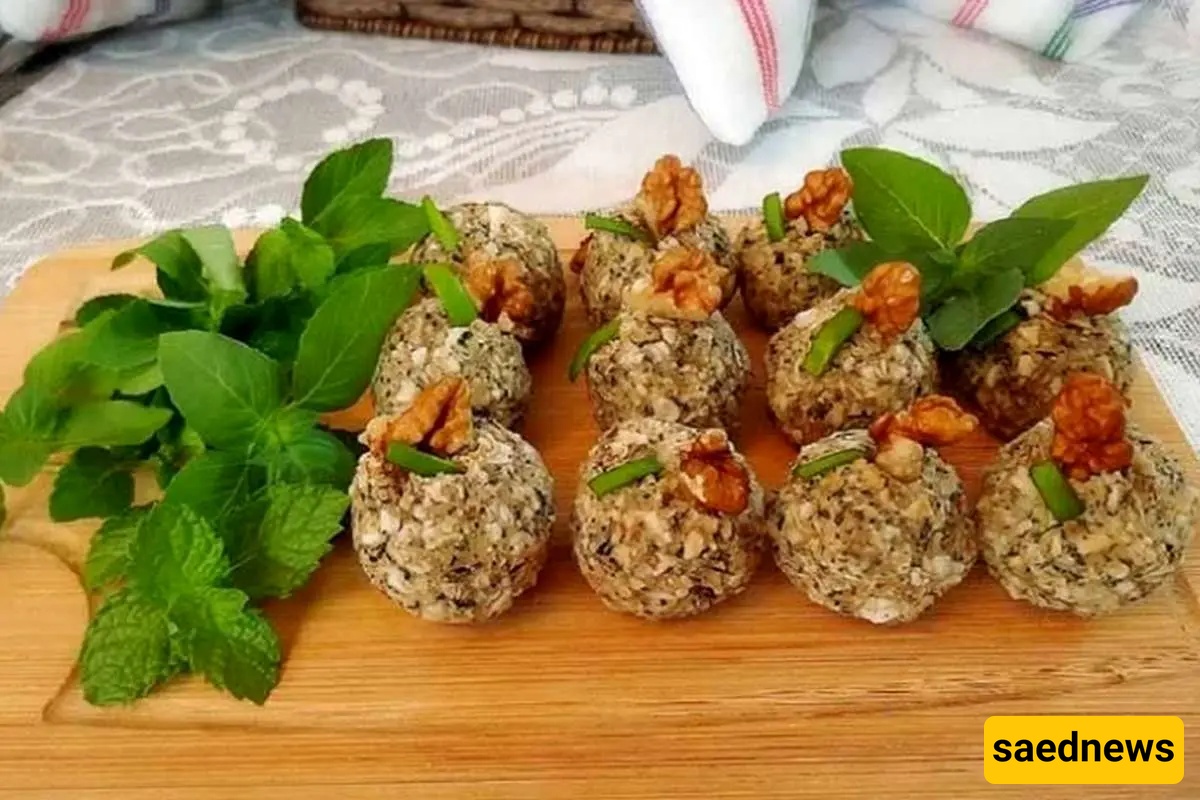 Spoon some mixture into your hands and shape into small balls or use silicone molds for a decorative presentation. Arrange the Dovimaj on a serving plate and garnish with cucumbers, tomatoes, and radishes.