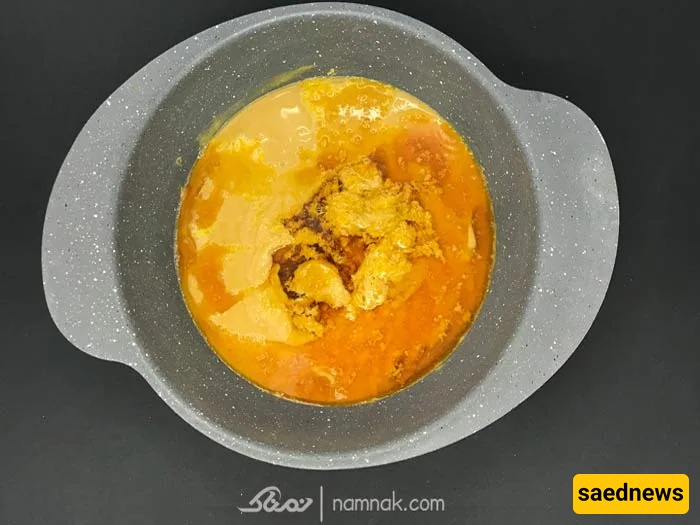 Next, remove from heat and add rosewater, ground cardamom, and saffron to the syrup. Mix gently to preserve the aroma.