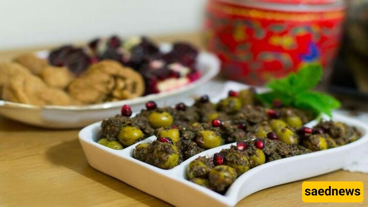 Marinated olives with walnuts, garlic, pomegranate molasses, and herbs, Zeytoon Parvardeh is a popular accompaniment that adds crunch and tang to any meal.