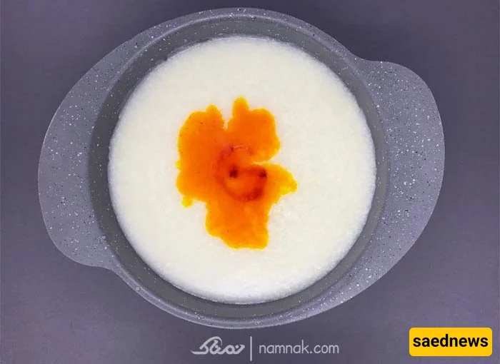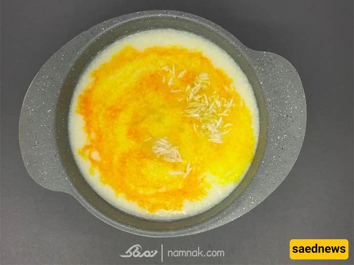 Grind 1 mesghal of saffron and dissolve it in a little hot water to let it bloom. Add the saffron to the rice and stir until the dessert takes on a vibrant yellow-orange color.