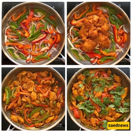 Heat 2 tablespoons of oil in a pan. Add the onion, bell peppers, and salt, and sauté for 3–4 minutes. Add the marinated chicken and mix well. Cover and cook over medium heat for 3–4 minutes. Uncover and cook for another 2–3 minutes, until the chicken is fully cooked. Turn off the heat and stir in the chopped cilantro.