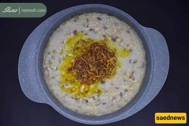 Once the soup is fully cooked, transfer it to a serving dish and garnish with kashk, fried onions, and fried mint.