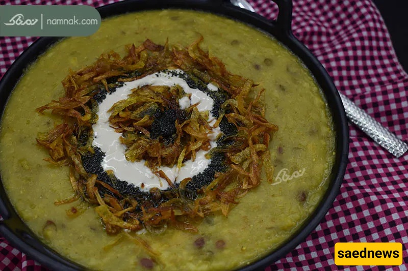 Like Ash Reshteh, this soup can be garnished with kashk (fermented whey), saffron kashk, fried onions, fried mint, and fried garlic.