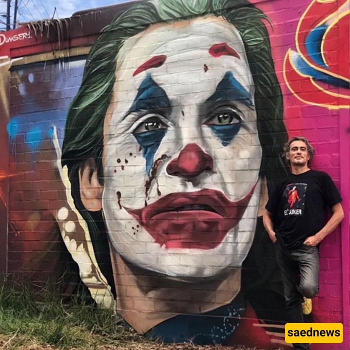 A photorealistic mural of Joaquin Phoenix as the Joker, painted in stunning detail on a brick wall. The artist stands beside the work, emphasizing both scale and the character’s likeness.