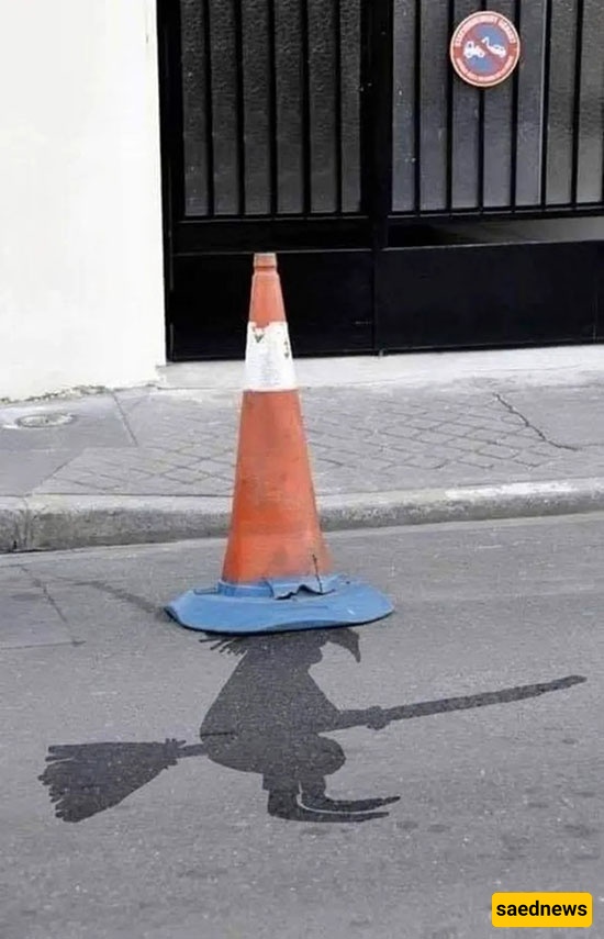 A traffic cone on the street is combined with a painted shadow of a wizard flying on a broomstick, transforming a simple object into a playful illusion.