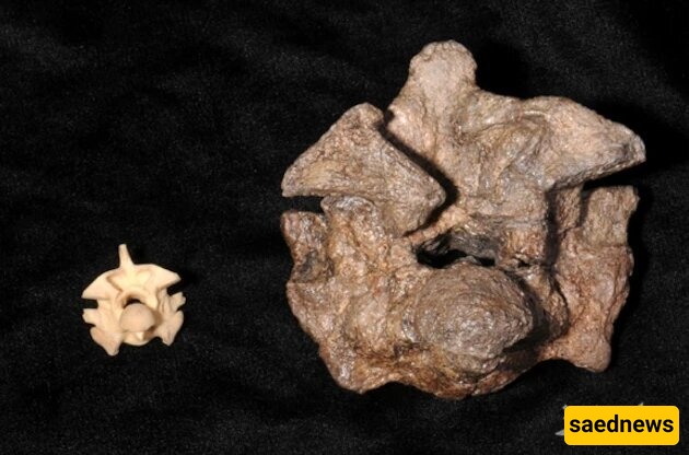 In this image, you see the vertebrae of two snakes. The smaller vertebra belongs to a 7-meter-long anaconda, recognized as the heaviest living snake in the world. The massive vertebra on the right belongs to Titanoboa, a colossal snake that weighed up to 1,000 kilograms and is now extinct.