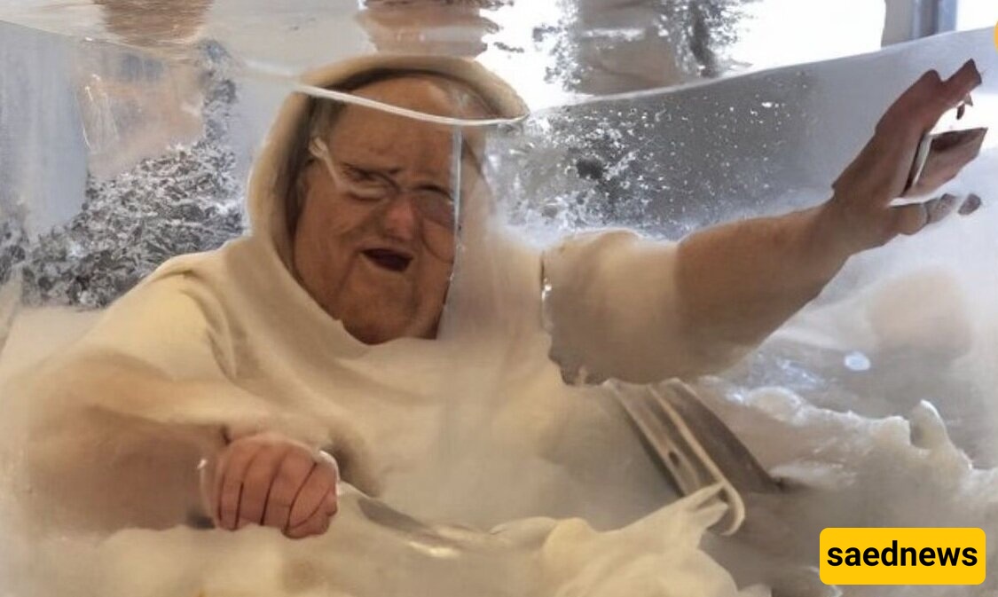 The image, shared on Twitter by a user named Chris Reagan, depicts a family allegedly encasing their grandmother in resin and placing her in the living room as a coffee table. In the photo, three family members are seen standing behind the table, smiling, while the grandmother’s face appears tilted to one side inside the resin.