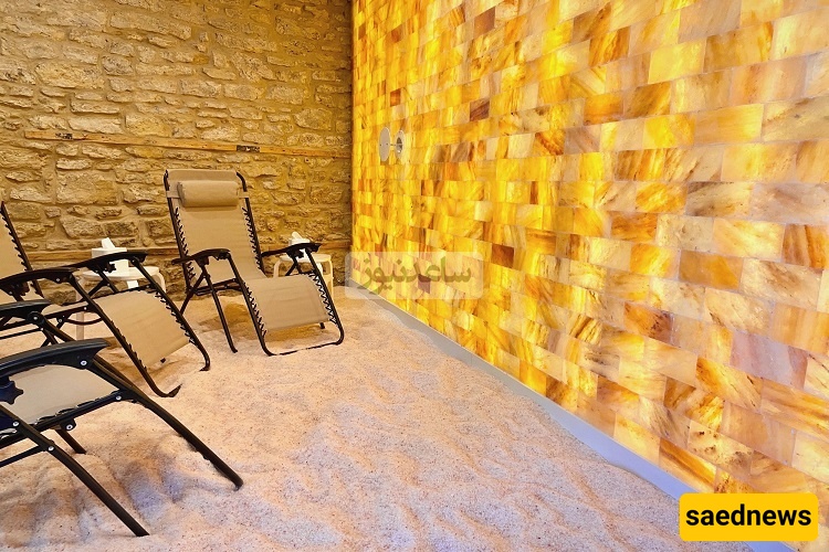 A unique relaxation space with walls of carved salt blocks and a floor of medicinal Aran salt, offering massage services.