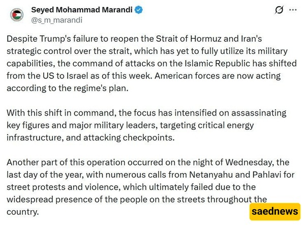 According to SAEDNEWS, Marandi stated that since the beginning of this week, leadership of the attacks has been transferred from Washington to the Israeli government, with U.S. forces now acting according to plans set by Israel.
