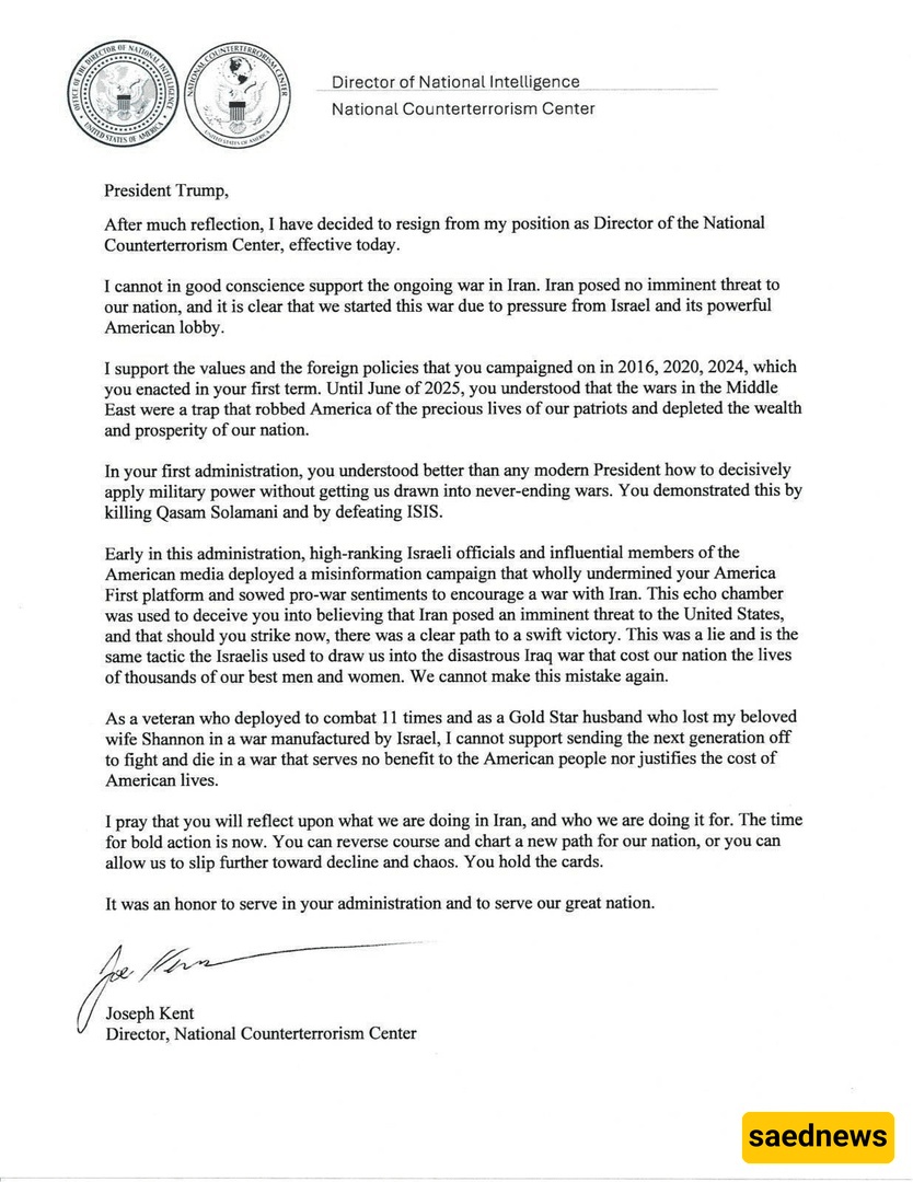 SAEDNEWS: Joseph Kent, director of the U.S. National Counterterrorism Center, has resigned from his position in protest of the ongoing military conflict with Iran, according to reports from American media outlets.