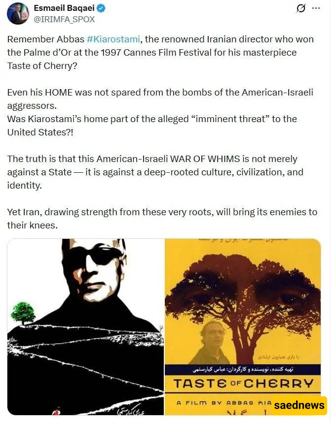 SAEDNEWS: Esmaeil Baghaei, spokesperson for the Ministry of Foreign Affairs, said: “Even Abbas Kiarostami’s home was not spared from the bombs dropped by U.S.-Israeli aggressors. Was Kiarostami’s home also part of the so-called ‘imminent threat’ against America?”