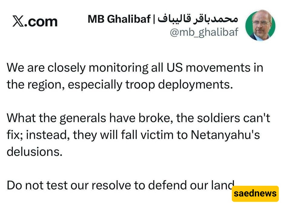 According to the political desk of Saed News, as reported by Khabar Online, Mohammad Bagher Ghalibaf, Speaker of the Islamic Consultative Assembly, wrote on the social media platform X: