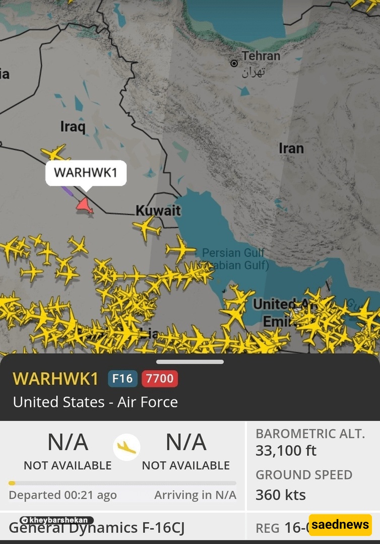 A U.S. F-16 fighter jet reportedly declared an emergency (code 7700) over Iraqi airspace and was forced to retreat.