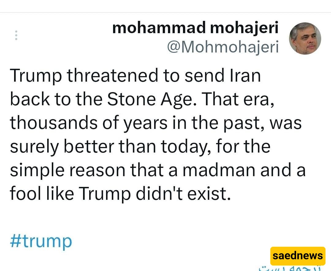 SAEDNEWS: Mohammad Mohajeri Reacts on Twitter to Trump’s Comments About Returning Iran to the Stone Age