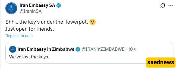The Iranian diplomatic mission in South Africa joined in on the joke, adding: “Shh… the keys are in the flowerpot. But we only open the doors for friends.”