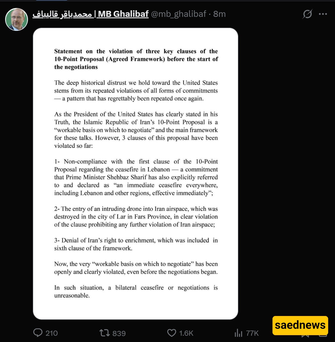 SAEDNEWS: Mohammad Bagher Ghalibaf wrote on Twitter that, in light of the United States’ violation of the ceasefire, bilateral negotiations are unreasonable under such circumstances.