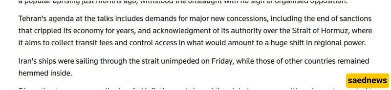 According to the political desk of Saed News analytical outlet, Reuters reported on today’s negotiations between the United States and Iran in Islamabad, Pakistan. The report states that Tehran’s agenda includes demands for significant concessions, notably the lifting of sanctions that have strained the country’s economy for years. It also calls for recognition of Iran’s authority over the Strait of Hormuz, where Tehran intends to impose transit fees on passing vessels and regulate access—an action that could signal a major shift in the regional balance of power.