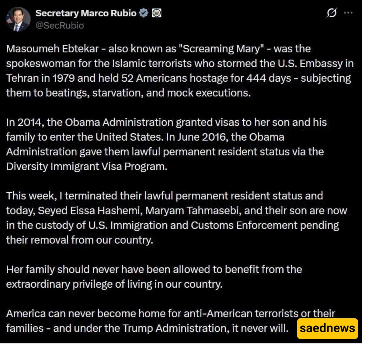 SAEDNEWS: Marco Rubio, the U.S. Secretary of State, announced in a post on the social media platform X that, under his directive, the permanent residency (Green Card) of Seyed Isa Hashemi—son of Masoumeh Ebtekar—has been revoked in the United States.