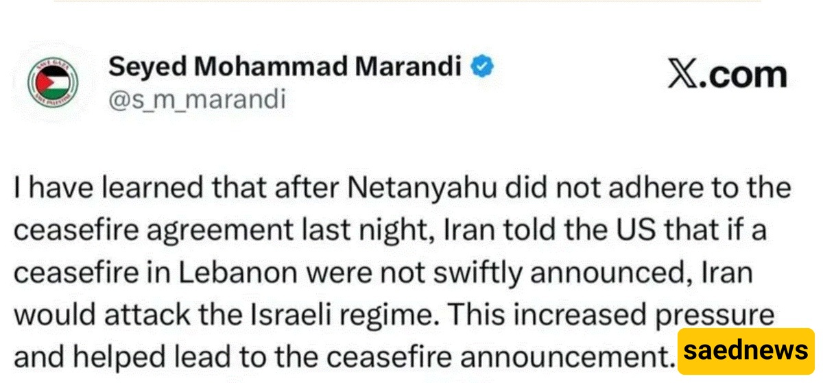 According to a report from the Saed News political desk, political analyst Mohammad Marandi posted on the social media platform X that: