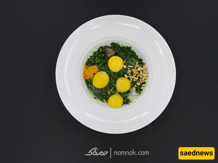 Clean and wash the fresh herbs carefully, then chop them finely. In a mixing bowl, combine the chopped herbs with eggs, chopped walnuts, salt, and your preferred spices (such as turmeric and pepper).