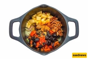 In a nonstick pot over medium heat, heat the oil and sauté the chopped onion until golden. Add the ground walnuts and stir-fry for 2 minutes, making sure not to burn them. Next, add the dried fruits, raisins, barberries, seasonings, and hot water. Mix well, reduce the heat, cover the pot, and cook for 5 minutes. Once done, remove from heat and set aside.