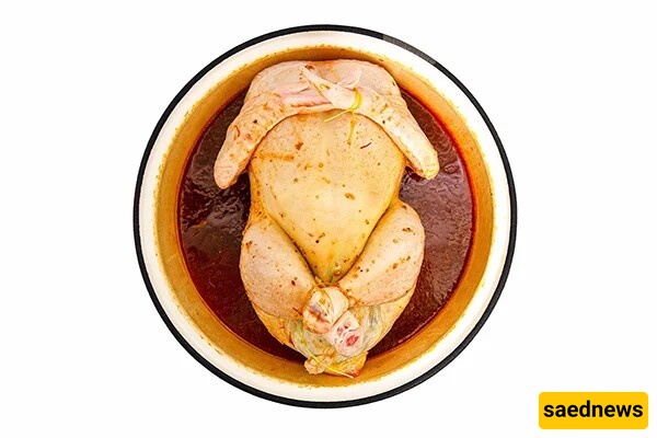 Start by cleaning the chicken thoroughly and removing any internal organs. Then, make a marinade using 1 cup of dissolved saffron, salt, pepper, and lemon juice. Rub this mixture all over the chicken and inside its cavity. Once coated, place the chicken in the refrigerator for at least 12 hours or overnight to fully absorb the flavors.