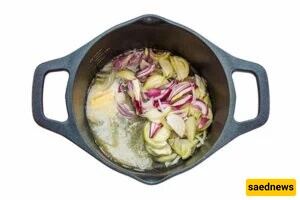 To prevent the chicken from sticking to the pot, place vegetables like potatoes, bell peppers, or carrots at the bottom. Herbs such as parsley or northern Iranian greens can also be added.
