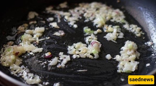 Heat oil in a pan. Grate garlic and sauté for 2–3 minutes. Add chopped spring onion (reserve the stems for later) and sauté for 10–15 seconds.