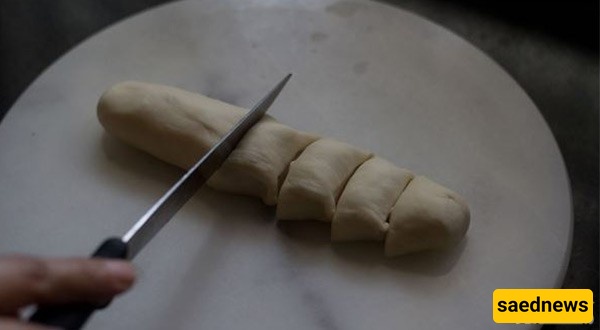 Divide the dough into two portions and roll each into a log. Cut each log into 6–7 pieces. Shape each piece into a ball and cover with a damp cloth.