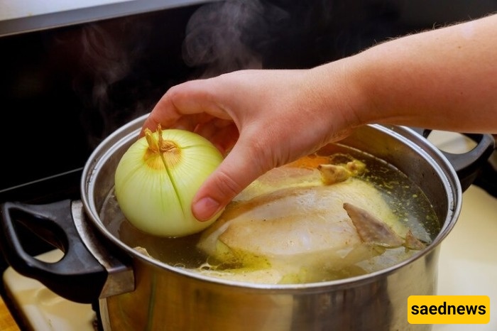 Do not discard the water used to cook the chicken. Strain it to remove large pieces like onion and carrot, and use it as the base for your soup. For a whiter soup, avoid adding turmeric to the stock.