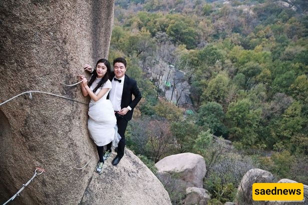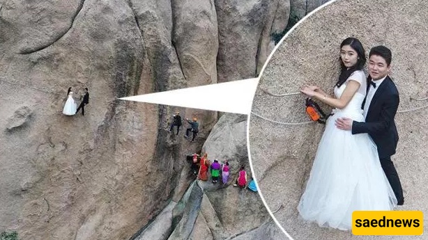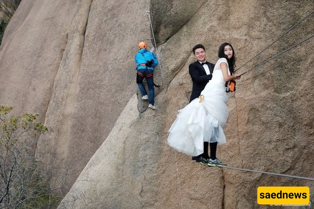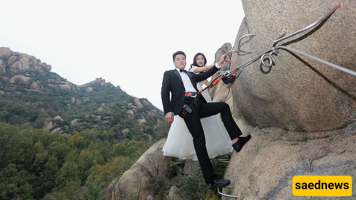 According to Saed News, a Chinese couple made an unusual decision to climb the perilous cliffs of Mount Zumadian in Henan Province, China, to celebrate their wedding day.